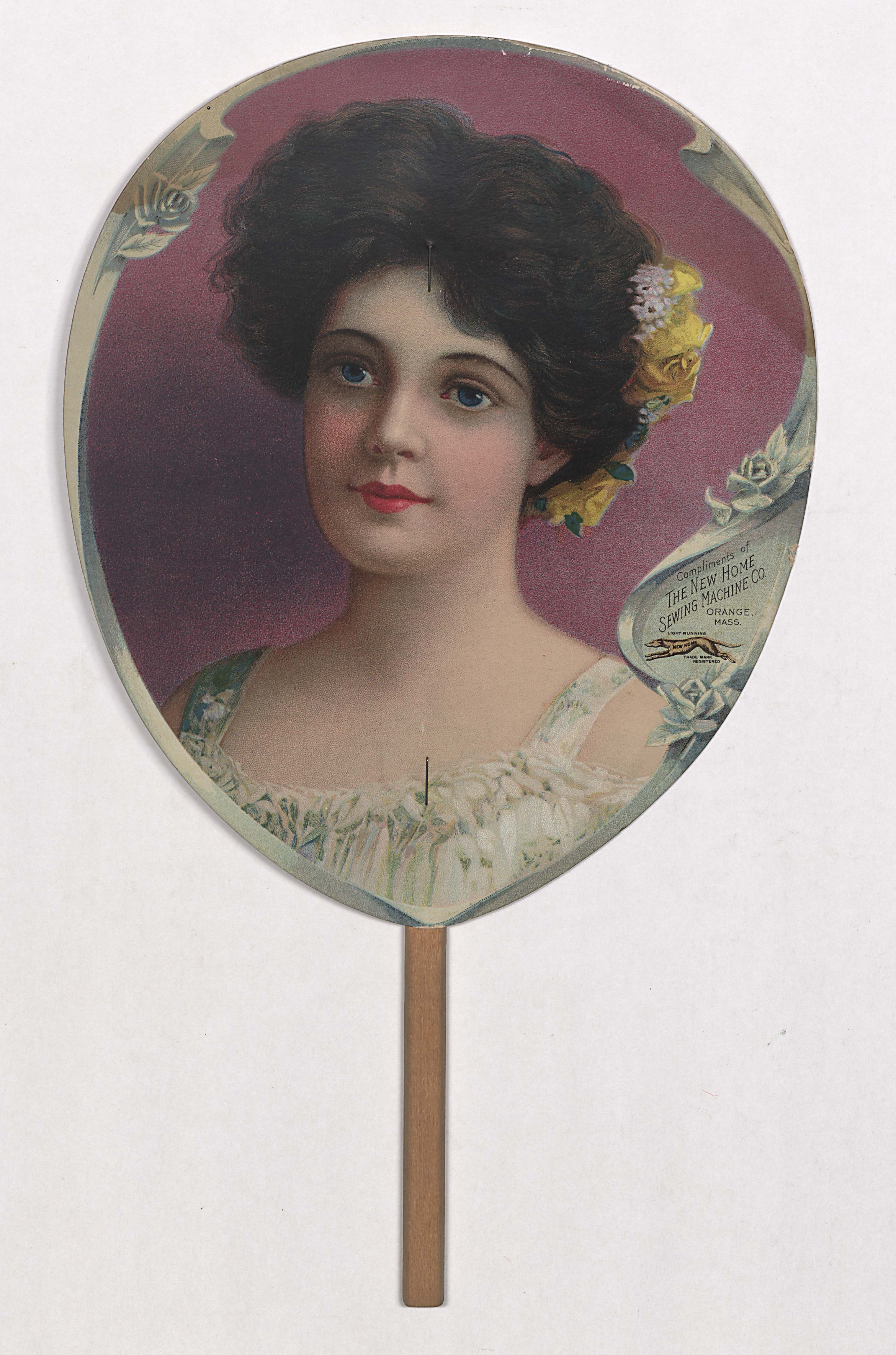 Hand fan from the New Home Sewing Machine Co., Orange, Massachusetts, featuring a portrait of a young woman. For the other side, see Image 59.