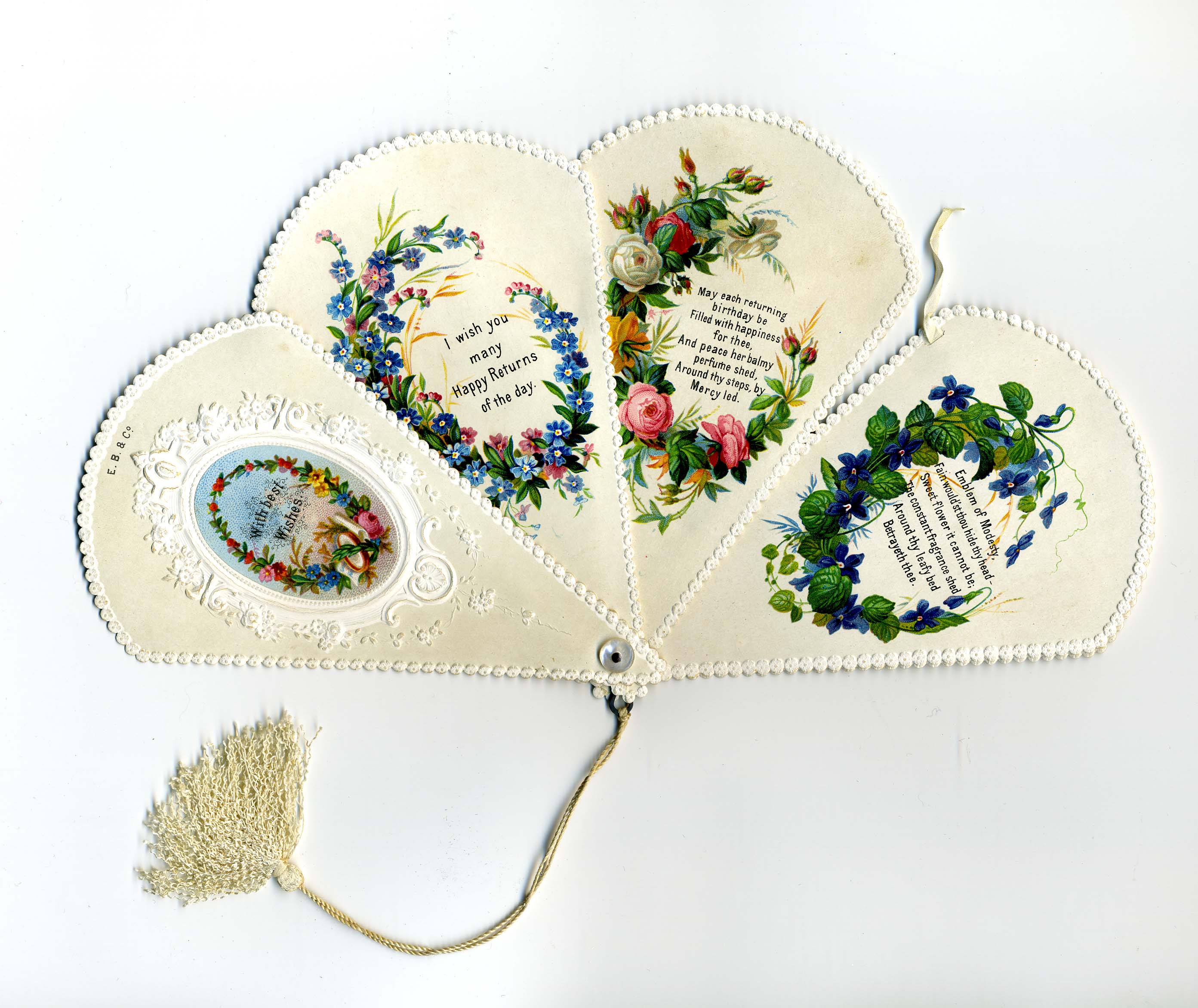 Sayings from William Shakespeare, William Wordsworth, Samuel Taylor Coleridge, and William Drummond appear on each of the sections of this fan. Their words relate to the flowers illustrated.