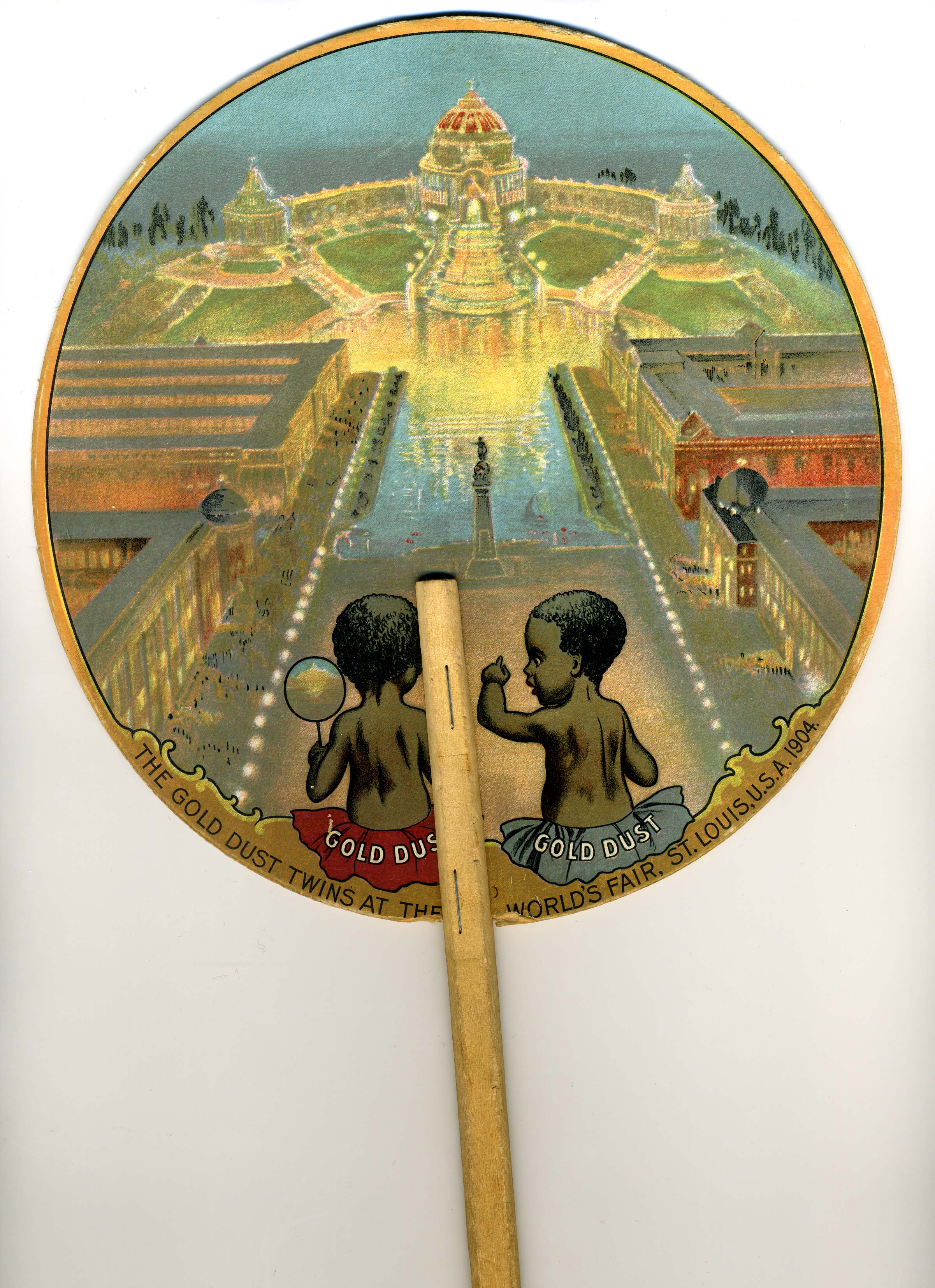 Hand fan with an advertisement for Fairbank’s Gold Dust Washing Powder, featuring the Gold Dust Twins. The ad coincided with the St. Louis World’s Fair of 1904.