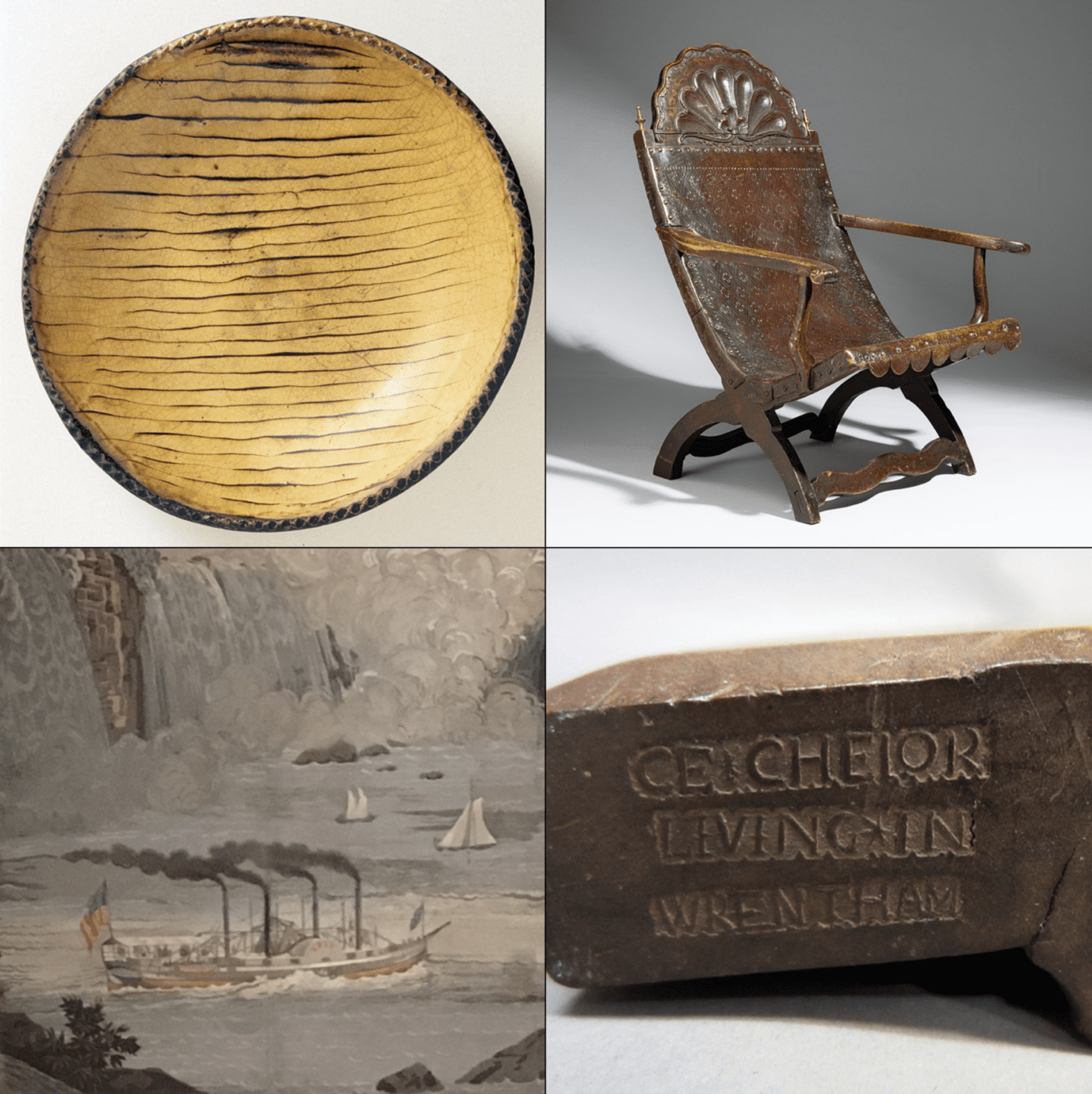 From left: Dish, England, 1720–80; earthenware, lead glaze. Bequest of Henry Francis du Pont 1958.1083 | Campeche chair, Campeche, Mexico, 1760–68; mahogany, original stamped leather seat (finials replaced). Museum purchase with funds drawn from the Centenary Fund 2022.0006 | Fragment of Views of North America (Niagara Falls), Zuber & Cie (manufacturer), Rixheim, France, ca. 1850–1900; woodblock printed wallpaper. Museum purchase with funds provided by the Henry Francis du Pont Collectors Circle 2018.0049.004 | Molding plane, Cesar Chelor (d. 1784), Wrentham, Massachusetts, ca. 1770; wood, iron; stamped “CE [star symbol] CHELOR / LIVING [star symbol] IN / WRENTHAM.” Museum purchase 1959.0074.002