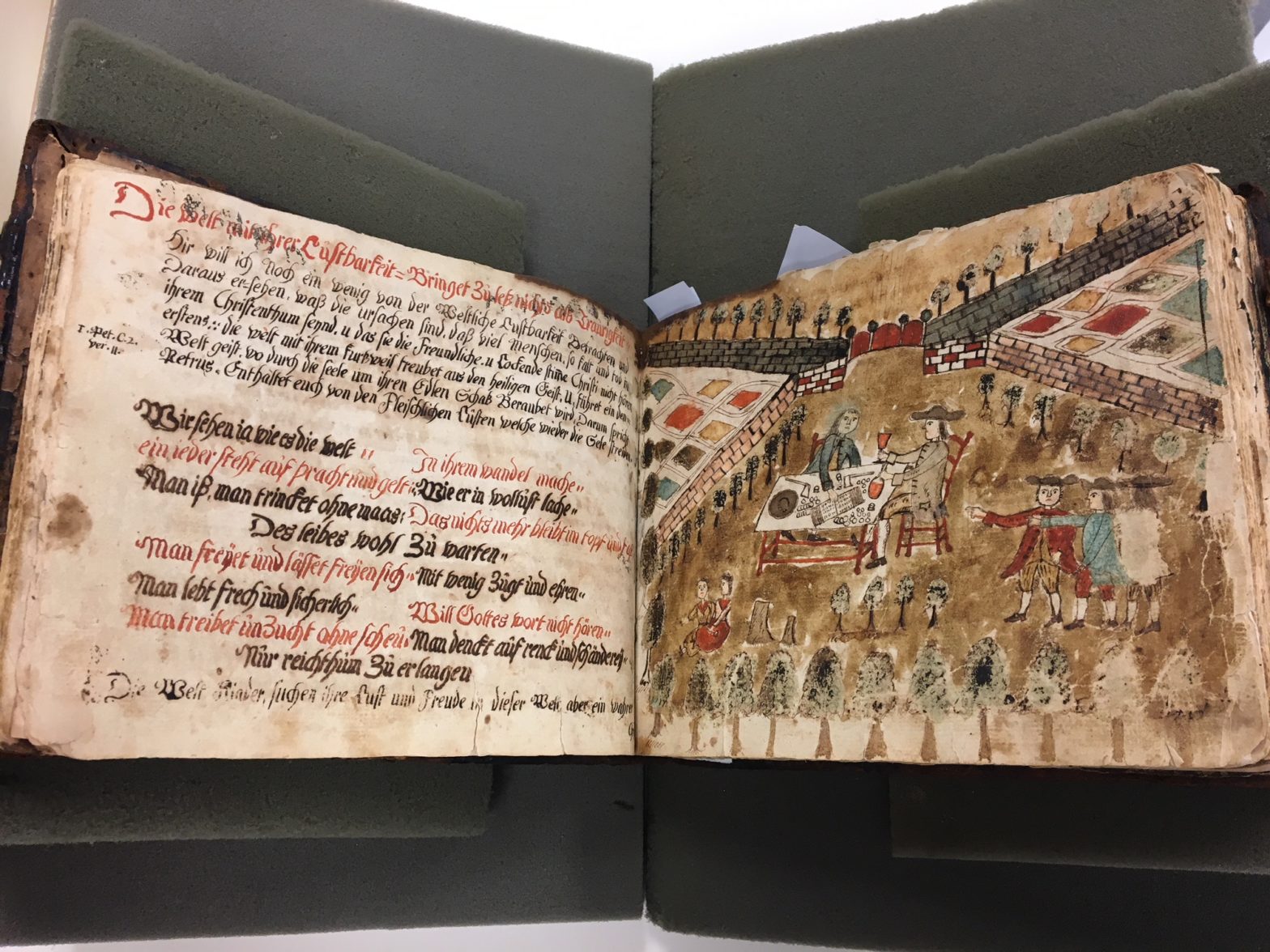 WINTERTHUR, DE (May 9, 2023) – A devotional manuscript made in the 1780s that is too fragile to display is being digitized and will be available to the public in 2024. On May 12, scholars and advisers will gather at Winterthur Museum, Garden & Library to discuss what the manuscript has revealed so far. They will share their work and perspectives on the manuscript and how it helps them better understand life and art in an early American borderland: the town of Lancaster, Pennsylvania.