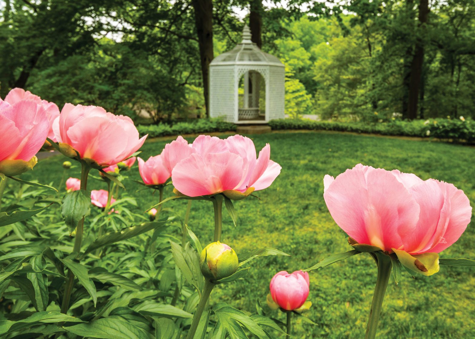 A celebration of full-blown spring, this area reaches its peak in late May. The peonies in this area are a horticultural treasure representing the best of the yellow, bronze, peach, and maroon Saunders peonies as well as an unparalleled planting of white, pink, and red herbaceous varieties selected with particular attention to flower form.