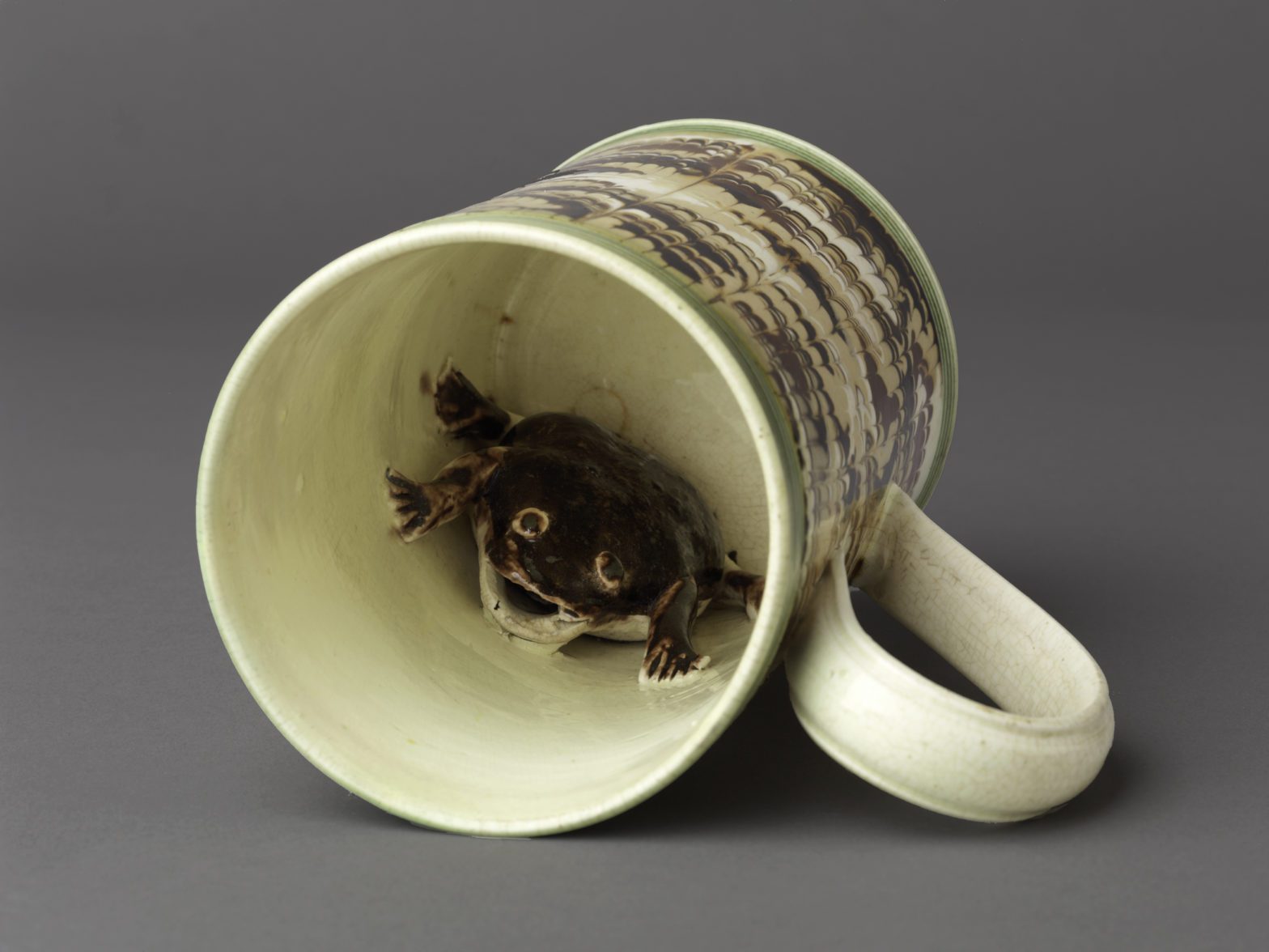 This English earthenware mug from the late 18th century, created with the practical joker in mind, has a fun secret: a fake frog inside seems poised to leap at the face of the unsuspecting user—a sort of precursor of the ice cube with the fake fly. Fill the mug with a dark liquid, hand to a friend, then enjoy the show. One can only guess how much joy the reaction gave the joker.