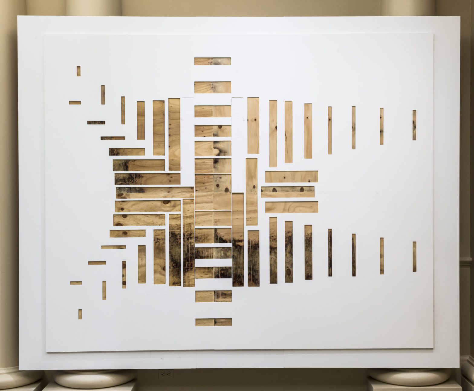 Among other things, Urist’s art addresses ideas about the environment, in part by using materials in unusual ways. She used parts of the tree she discovered on Instagram, known as the Brown’s Meadow Oak, to create one of two related works in TransformationsFragmented Memories, made of paper over wood, expands a milling pattern into pieces the viewers can remove and keep, thus involving them in the work’s evolution. Bonded Memories, made of paper embossed with the oak’s rings, imagines the tree reassembled.