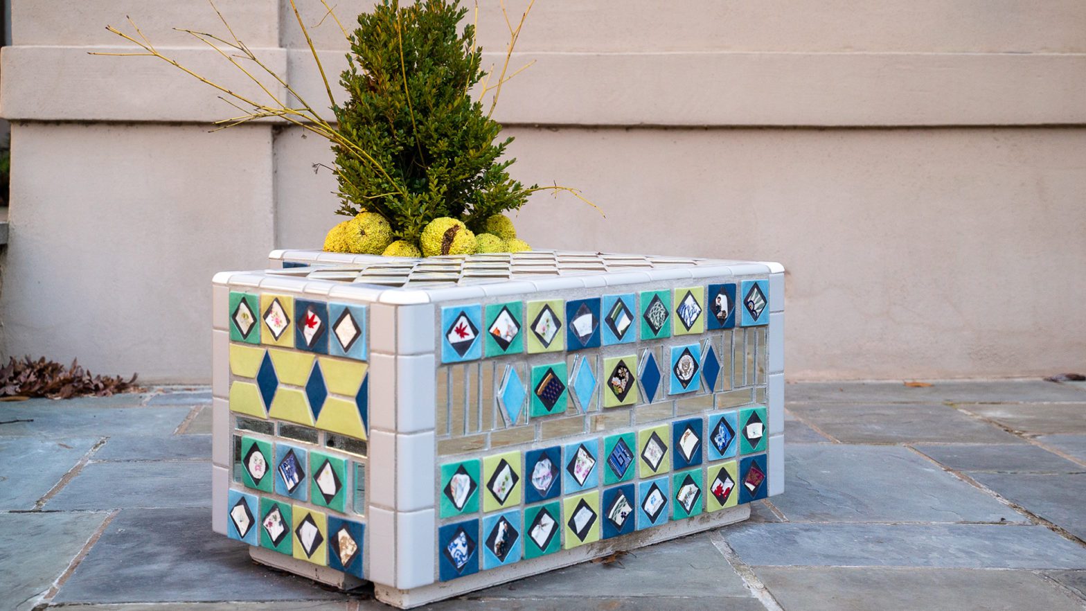 The mosaic bench is part of a new exhibition, Upcycled!, which asks viewers to consider how old things can be reused creatively while also creating a community by working with local nonprofit organizations to make and display works of art. The work of many hands, the bench is an expression of caring that unites Winterthur and project partner Creative Vision Factory with Duffy’s Hope Garden in Wilmington and the New Castle County Hope Center, which provides transitional housing for the homeless. Winterthur’s collaboration with these partners included support and supplies for Creative Vision Factory artists to create benches at Winterthur, Duffy’s Hope Garden, and the Hope Center, as well as support for a tile monument at the Delaware State Hospital’s historic Spiral Cemetery that memorializes more than 700 souls who died in state care without being claimed by family between 1891 and 1983.