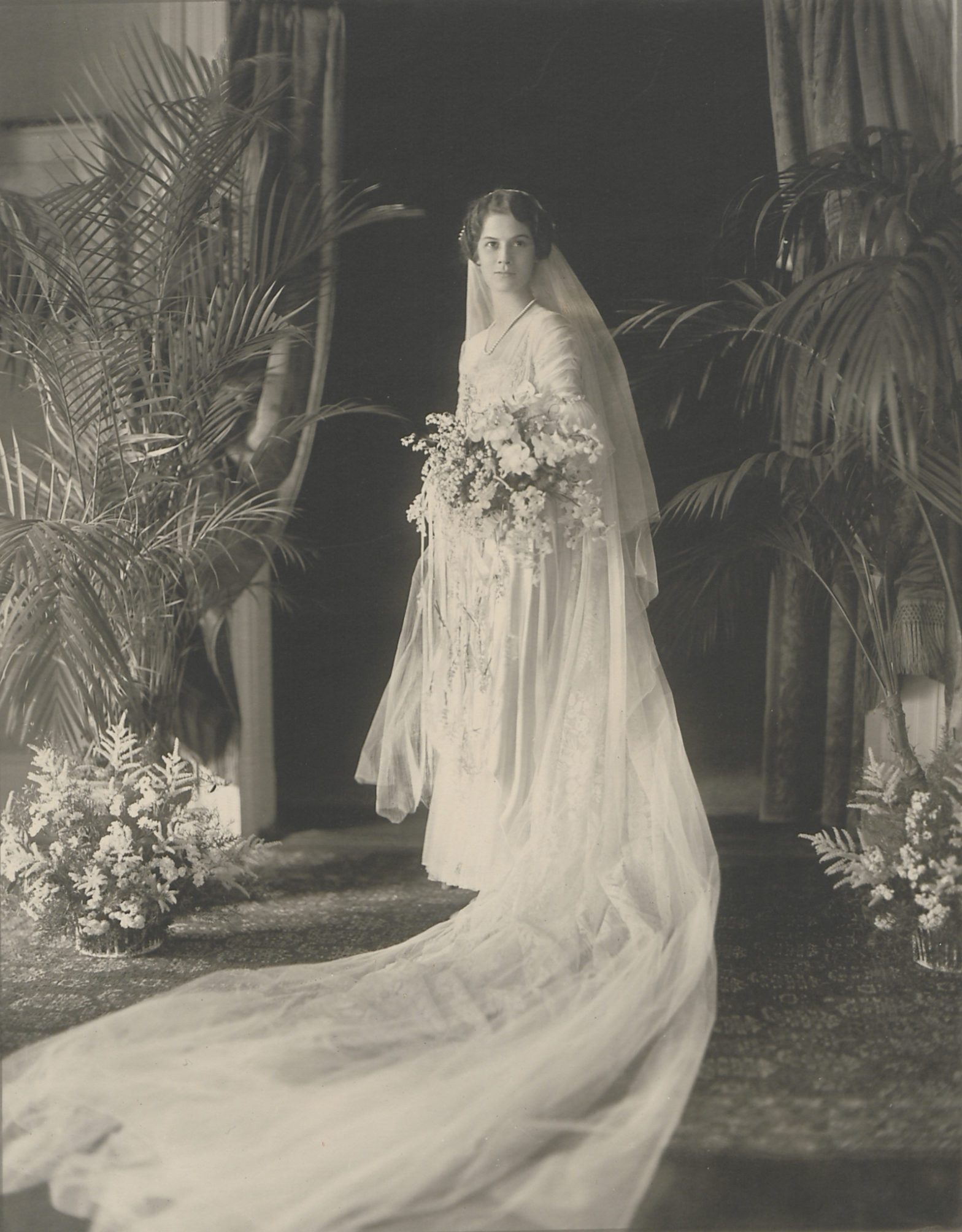 Further, the silver material was itself a luxury, with historical precedent established by royal brides in Europe. The fabric made a strong implication about the significance of her marriage to the wealthy Henry Francis du Pont. Both bride and groom came from socially prominent families.