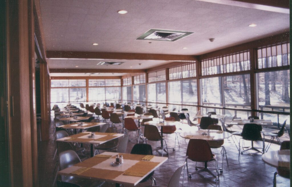 The building opened April 25, 1961, in time for the tenth annual Spring Tour. Herman Miller furniture—stacked chairs in red, two shades of grey, and tan placed around white tables—filled the dining room. As a whimsical touch, du Pont added carousel figures in one corner. Sliding wood dividers screened the cafeteria area and could create smaller seating areas if desired. The large glass window panels could slide open to let the outside in. The tall atrium space held towering potted palm trees.